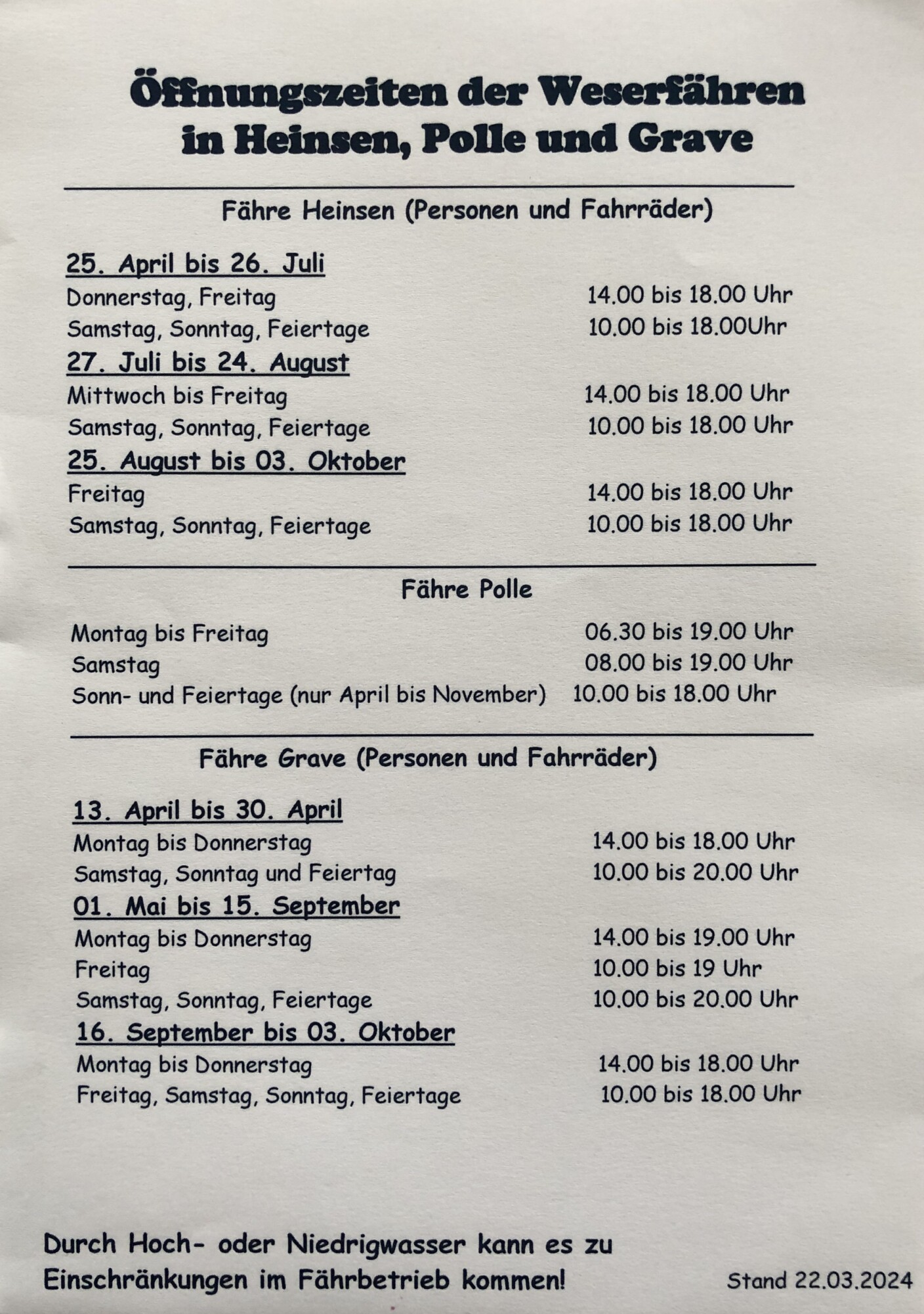 Öffnungszeiten der Weserfähren in Heinsen, Polle und Grave 2024